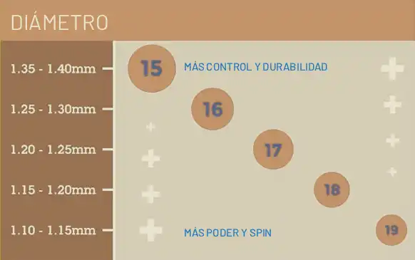 Calibre recomendado: 1.20mm-1.25mm. Los calibres más finos se mueven más en la raqueta (ese «snapback» del que hablamos antes), lo que genera aún más spin. Eso sí, se rompen más rápido.