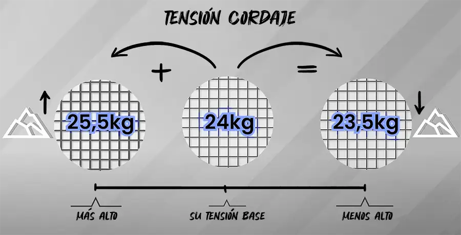 Las tensiones varían según la estrategia. No es solo «alta o baja tensión». Un jugador puede usar 25kg para el primer set contra un rival defensivo, y cambiar a 23kg si necesita más potencia en sets decisivos.